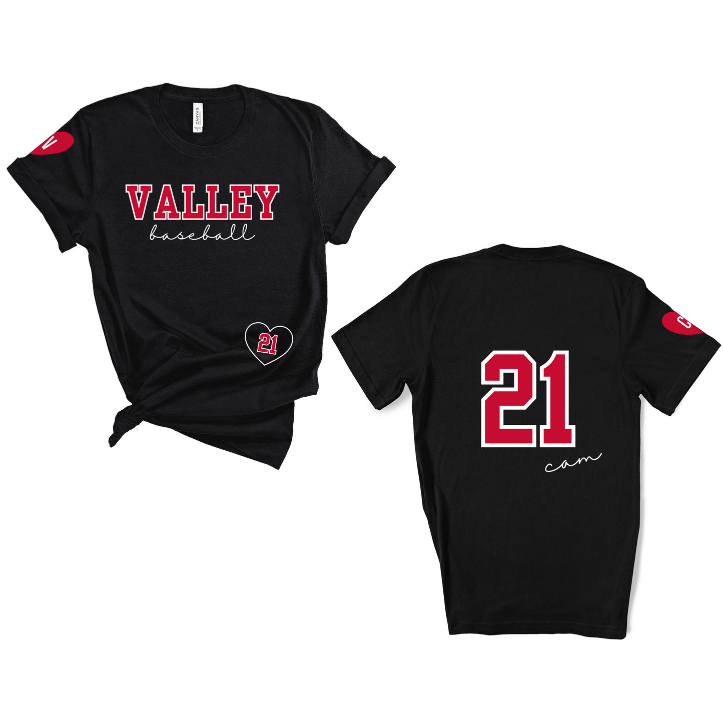 Valley Sports Tee customized with your favorite sport. Sleeve shows off a CV Heart.